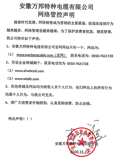 鄭重聲明:安徽萬邦特種電纜有限公司官方網站為:www_wanbangcable_com.721du.com,除此之外無任何子網站或合作網站,其余均為假冒偽劣。電話:0550-7621728 13485756353 地 址:安徽省天長市滁州高新技術產業開發區經四路29號